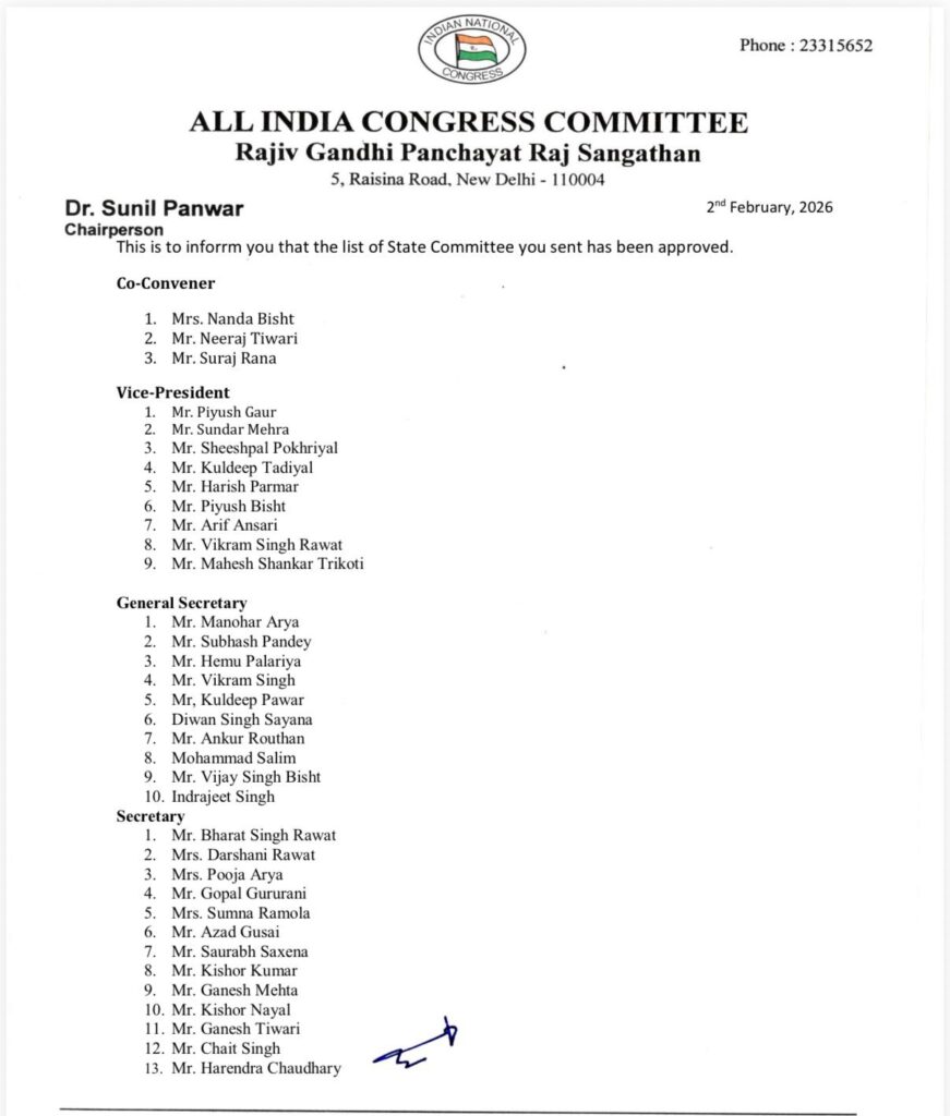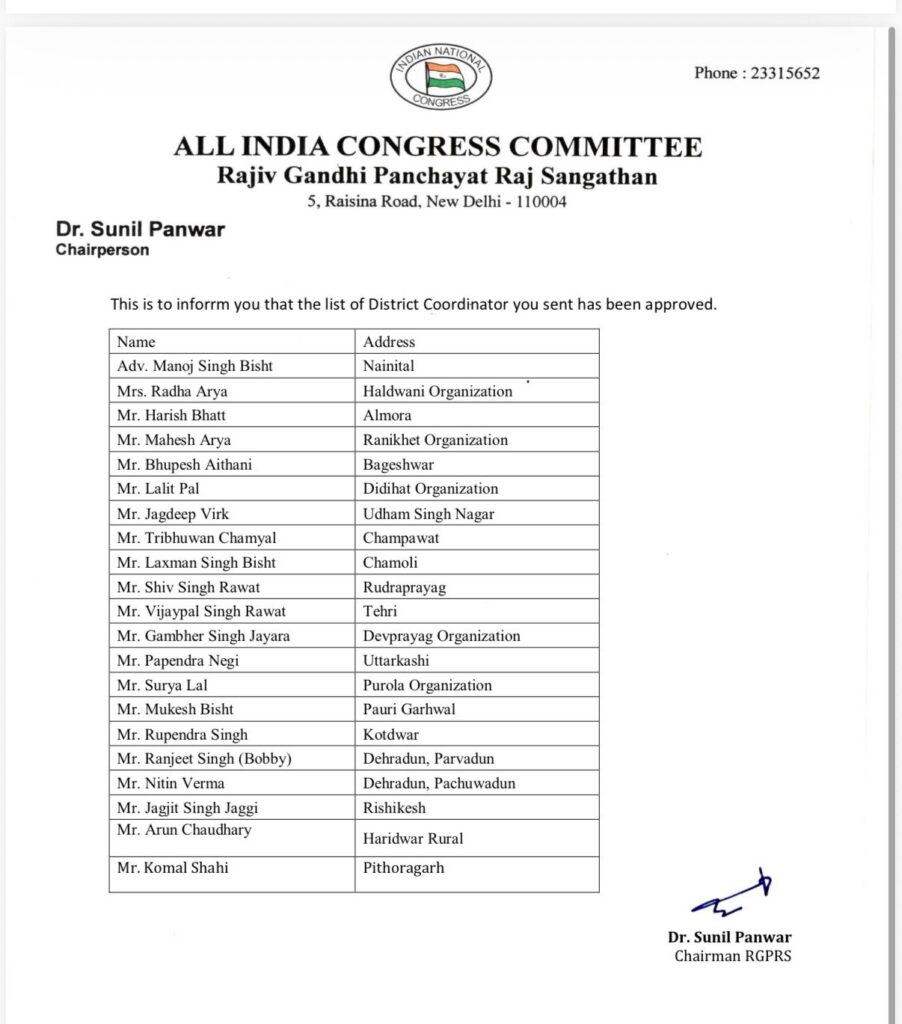 अखिल भारतीय राष्ट्रीय कांग्रेस ने वरिष्ठ कांग्रेसी नेता, उत्तराखंड राज्य आंदोलनकारी, पूर्व जिला पंचायत सदस्य एवं प्रदेश प्रवक्ता कांग्रेस नीरज तिवारी को राजीव गांधी पंचायती राज संगठन का कार्यवाहक प्रदेश अध्यक्ष मनोनीत किया।