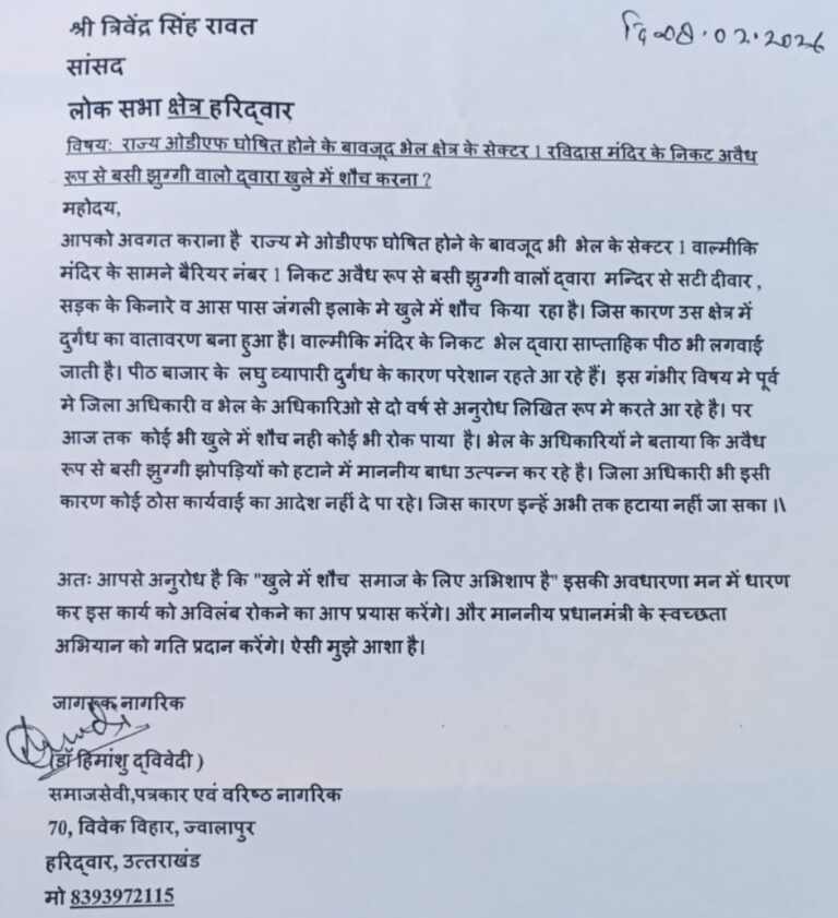 हरिद्वार। भेल क्षेत्र में खुले मे शौच होने की शिकायत पिछले 2 वर्षों से करते आ रहे है। और तहसील दिवस से लेकर जिलाधिकारी के जनसुनवाई कार्यक्रम तक उक्त शिकायत की गई पर नतीजा शून्य रहा हैं। विवश होकर समाजसेवी डॉ हिमांशु द्विवेदी ने हरिद्वार के सांसद त्रिवेंद्र सिंह रावत से कहा कि राज्य में ओडीएफ लागू है उसके बावजूद भी भेल क्षेत्र समेत आस पास के ग्रामीण क्षेत्रों में आज भी लोग खुले में शौच कर रहे हैं।
