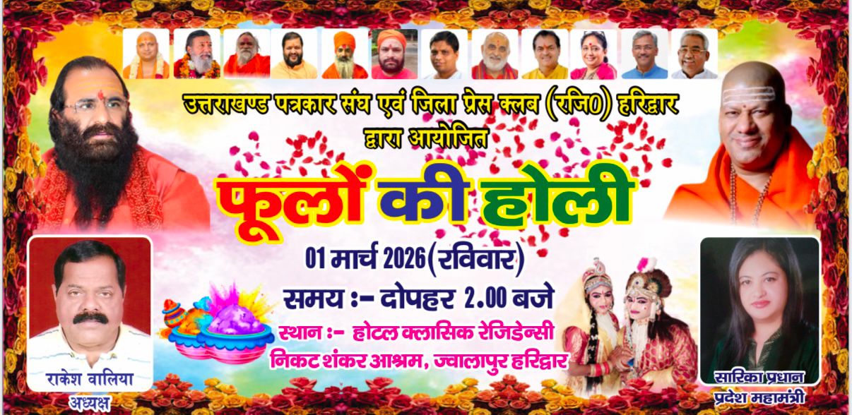 हरिद्वार , रविवार पत्रकार एवं जिला प्रेस क्लब द्वारा आयोजित फूलो की होली का कार्यक्रम किया गया। कार्यक्रम का सुभारम्भ आखाड़ा पीठाधीश्वर राजगुरु आचार्य महामंडलेश्वर , बीजेपी के वरिष्ठ नेता ,पूर्व मुख्यमंत्री व सांसद त्रिवेन्दर सिंह रावत , पूर्व संसद मंत्री व बीजेपी के वरिष्ठ नेता मदन कौशिक व अन्य संतो द्वारा दीप प्रज्वलन करने से हुआ। कार्यक्रम राकेश वालिया व सारिका प्रधान ,जी के नेतृत्व में सम्पन हुआ।