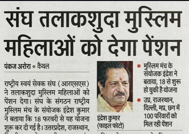 लखनऊ (उत्तर प्रदेश) , जयपुर (राजस्थान) , दिल्ली, भोपाल (मध्य प्रदेश ) व छग में मुस्लिम मंच के संयोजक इंद्रेश के अनुसार, 18 फरवरी से तलाकशुदा मुस्लिम महिलाओं को पेंशन दिए जाने की योजना शुरू हो गई है। इस खबर को लेकर राजनीतिक और सामाजिक हलकों में चर्चा तेज हो गई है। बताया जा रहा है कि राष्ट्रीय स्वयंसेवक संघ से जुड़े प्रयासों के तहत उत्तर प्रदेश, राजस्थान, दिल्ली, मध्य प्रदेश और छग क्षेत्र में करीब 100 परिवारों को आर्थिक सहायता प्रदान की जा रही है।
