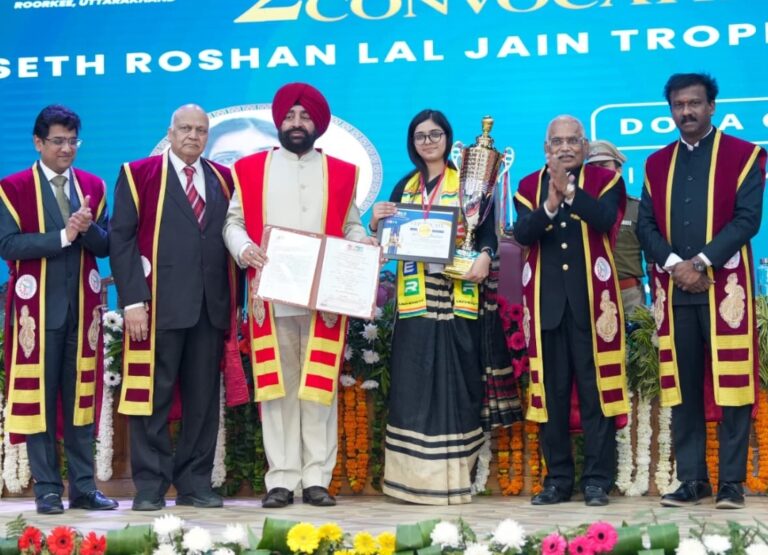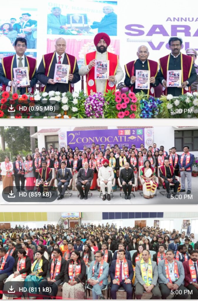 राज्यपाल ने विश्वविद्यालय की उपलब्धियों की सराहना करते हुए शोध, नवाचार, उद्योगों से एमओयू एवं वैश्विक प्रतिस्पर्धा में आगे बढ़ने के प्रयासों की प्रशंसा की। उन्होंने उत्कृष्ट प्रदर्शन करने वाले विद्यार्थियों, विशेषकर स्वर्ण पदक विजेताओं को बधाई देते हुए उनके उज्ज्वल भविष्य की कामना की। दीक्षांत समारोह में सेठ रोशन लाल जैन ट्रॉफी तीन विद्यार्थियों सुश्री आयुषी पंवार (बी. कॉम ऑनर्स, 2022-25) को विश्वविद्यालय स्तर पर उच्चतम 9.9 सीजीपीए प्राप्त करने के लिए, सुश्री डोना चौहान (डिप्लोमा इन सिविल इंजीनियरिंग, 2023-25) को 9.16 सीजीपीए हासिल करने के लिए और श्री हनी चौधरी (एमसीए, 2023-25) को 9.5 सीजीपीए हासिल करने के लिए दी गई। जनपद आगमन पर जिलाधिकारी मयूर दीक्षित एवं वरिष्ठ पुलिस अधीक्षक नवनीत सिंह भुल्लर ने तुलसी का पौधा भेंटकर महामहिम राज्यपाल का स्वागत किया। दीक्षांत समारोह की अध्यक्षता यूनिवर्सिटी रजिस्ट्रार, डॉ. अजय शर्मा ने की। इस दौरान ग्लोबल टेलीकॉम एंड एजुकेशन एसोसिएशन के चेयरमैन, प्रो. एन. के. गोयल, विशिष्ट अतिथि के रूप में मौजूद रहे। दीक्षांत समारोह में विश्वविद्यालय के प्रेसिडेंट जे.सी.जैन, अपर जिलाधिकारी प्रशासन पी आर चौहान, एसएसपी देहात शेखर सुयाल, उप जिलाधिकारी हरिद्वार जितेंद्र कुमार, ज्वाइंट मजिस्ट्रेट रुड़की दीपक रामचंद्र सेठ, वाइस प्रेसिडेंट डॉ. श्रीयांस जैन, प्रो-वाइस चांसलर डॉ. चिन्नेयान रामासुब्रमण्यम, फैकल्टी मेंबर्स और छात्र-छात्राएं मौजूद रहे।